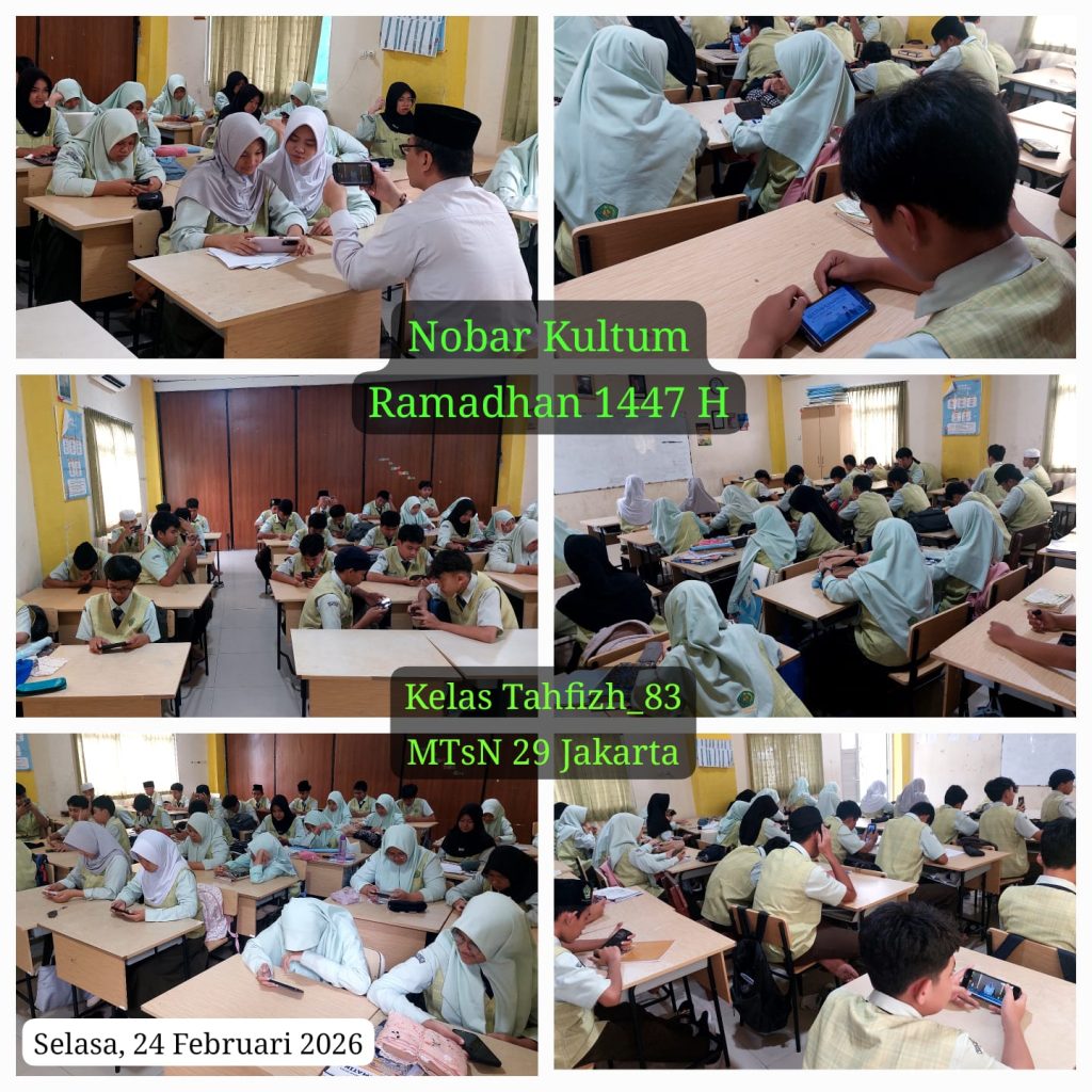 Jakarta (HUMAS MTsN 29 Jakarta) – Dalam rangka meningkatkan keimanan dan ketakwaan di bulan suci Ramadhan, MTsN 29 Jakarta menyelenggarakan kegiatan Nobar Kurma (Nonton Bareng Kajian Ramadhan) pada Selasa (24/02/2026). Kegiatan ini dilaksanakan di ruang kelas masing-masing dengan menonton bersama siaran dari akun youtube PENMAD KANWIL DKI JAKARTA.